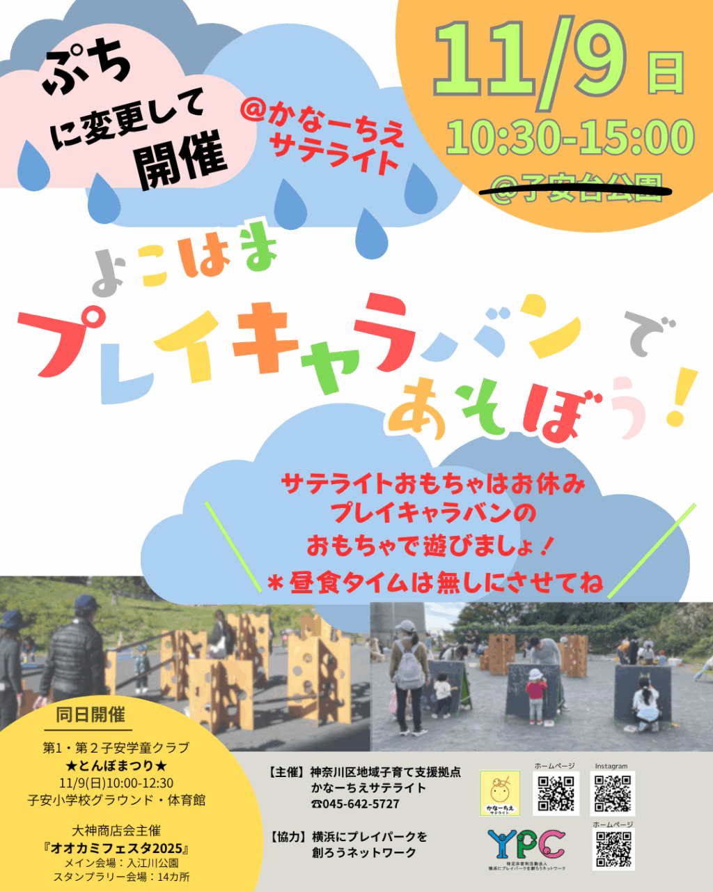 11/9「よこはまプレイキャラバンであそぼう」はサテライトで「ぷち開催」 お知らせ 2025.11.08 通常のサテライトではなく、プレイキャラバンのおもちゃで遊びます。昼食タイムは無しとなります。お待ちしています♪