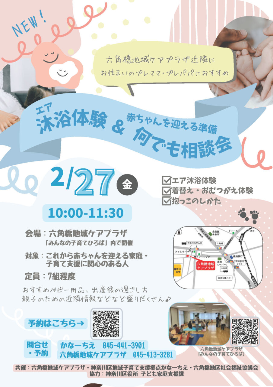 【満員】2/27(金)エア沐浴体験&赤ちゃんを迎える準備何でも相談会@六角橋地域ケアプラザ お知らせ 2026.01.102026.02.13 六角橋地域ケアプラザ近隣にお住まいのプレママ・プレパパにおすすめ!エア沐浴体験、着替えおむつがえ体験、抱っこのしかたも体験できます。おすすめベビー用品、出産後の過ごし方、近隣情報などなど盛りだくさん。六角橋地域ケアプラザ「みんなの子育て広場」内で開催します。広場に来ている親子さんとも交流できます。 対象:これから赤ちゃんを迎える家庭・子育て支援に関心のある人定員:7組程度
