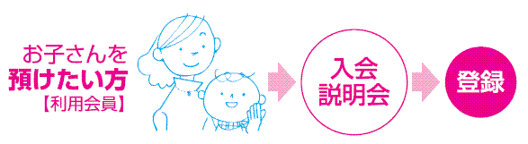 ①子育てサポートシステムのしくみを知っていただくために、まず入会説明を受けていただきます。