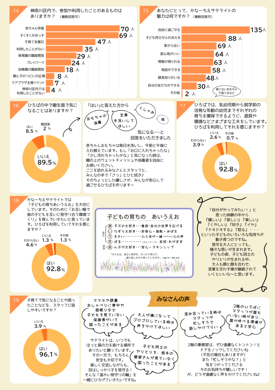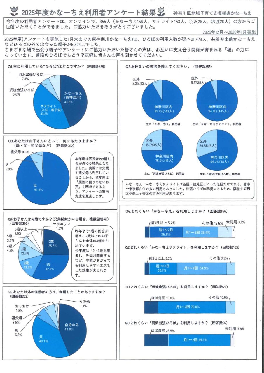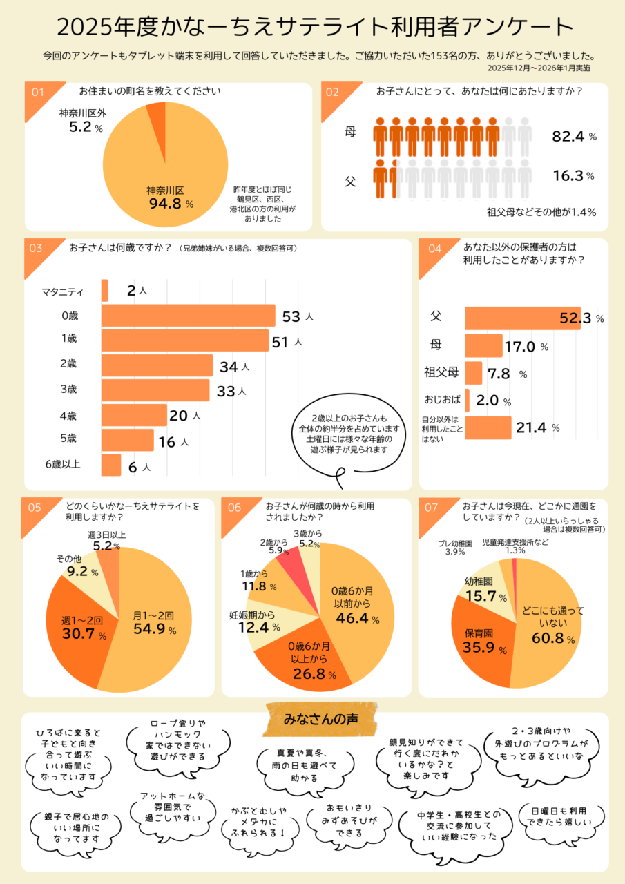 利用者アンケート 2024.08.162026.03.10 かなーちえ・かなーちえサテライトでは、利用状況や利用者の皆さまのご意見を知るために、年に一度、利用者アンケートを実施しています。 かなーちえ(東神奈川) 2025年度 アンケート結果 クリックすると拡大表示できます。 かなーちえサテライト(入江・新子安) 2025年度 アンケート結果