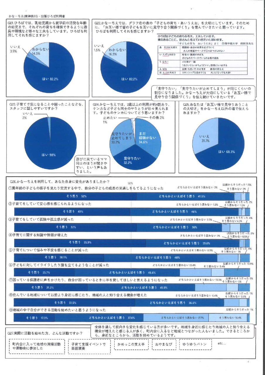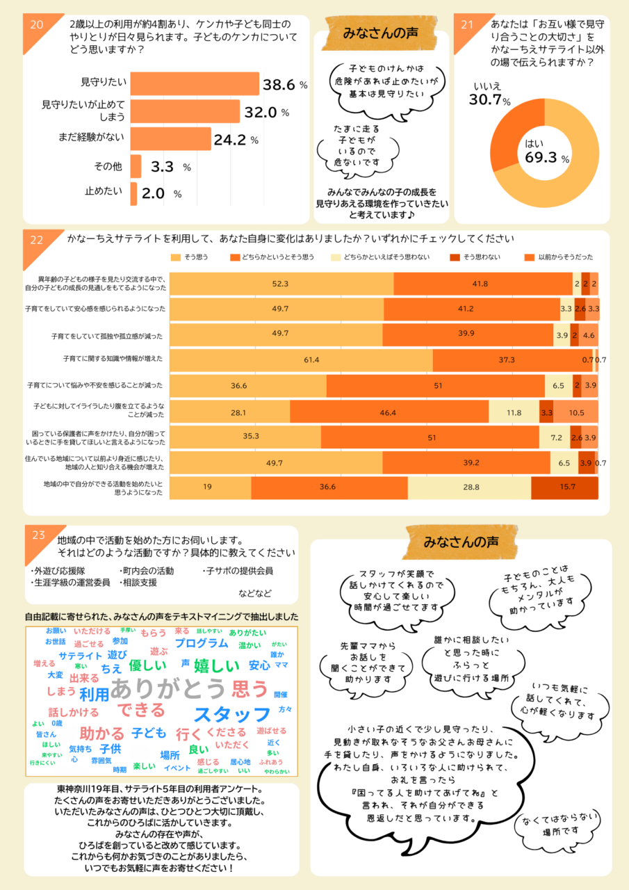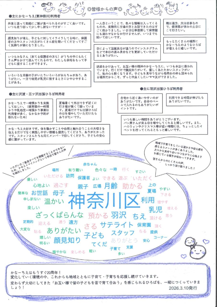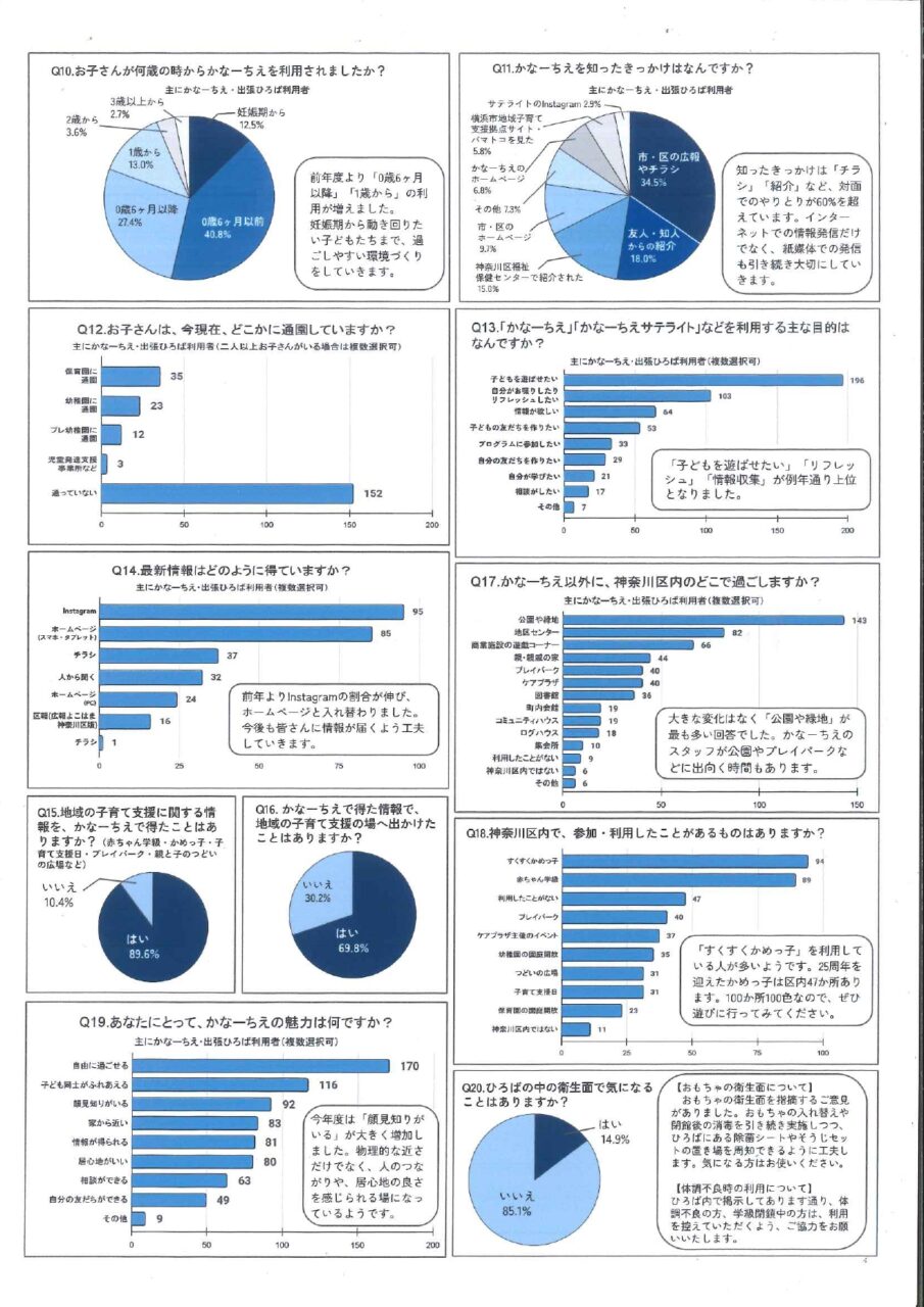 利用者アンケート 2024.08.162026.03.10 かなーちえ・かなーちえサテライトでは、利用状況や利用者の皆さまのご意見を知るために、年に一度、利用者アンケートを実施しています。 かなーちえ(東神奈川) 2025年度 アンケート結果 クリックすると拡大表示できます。 かなーちえサテライト(入江・新子安) 2025年度 アンケート結果